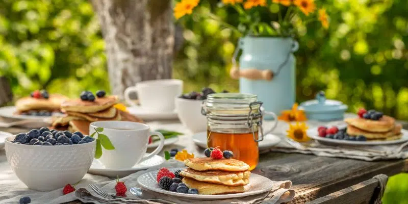 Foto: gedeckter Tisch mit Croissants, Käse, Schinken, Ei, Tee. © Foodfibel.de